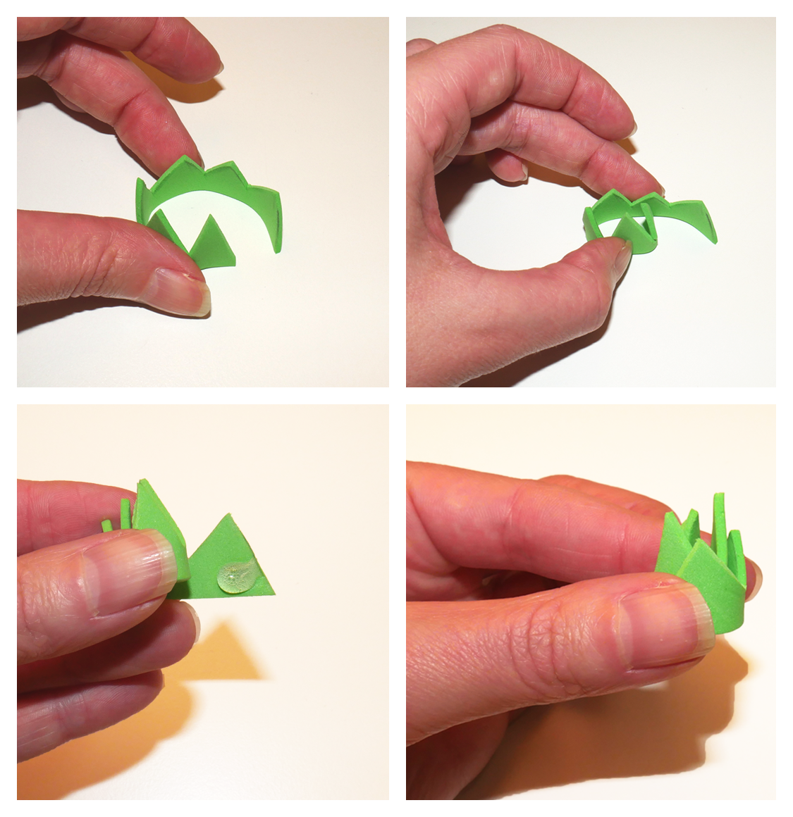 3. Jetzt kannst Du vorsichtig mit braunen permanent Marker Zacken auf das Ü-Ei malen. Pass dabei auf, dass Du das Gesicht nicht verschmierst. Damit es jetzt eine richtige Ananas wird, setzten wir ihr nun die Krone auf. Nimm Dir die grüne Moosgummiplatte und zeichne mit dem Bleistift erst große und dann etwas kleiner werdende Zacken auf. Nun kannst Du die Zacken mithilfe der Schere an der Bleistiftmine ausschneiden. Jetzt ist es an der Zeit, sich die Klebepistole zu schnappen. Steck die Klebepistole an und versichere dich, dass auch Kleber in der Pistole ist. Sobald der Kleber flüssig ist, kannst Du einen kleinen Klecks an das kleine Ende der Zackenkrone platzieren. Roll die Zacken von groß zu klein zusammen und drücke die Stelle mit dem Kleber fest an. Ist der Kleber fest, kannst Du nun einen etwas größeren Klecks Kleber auf den Deckel des Ü-Eis kleben. Nun kann es zu Körnung kommen. Setzte die grüne Zackenkrone auf den eben gesetzten Kleber.