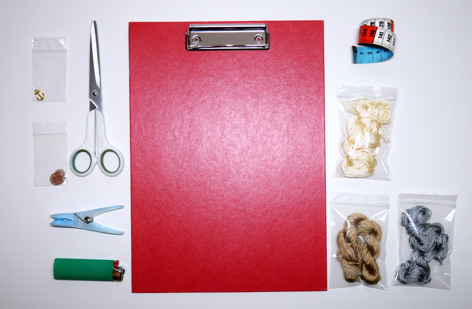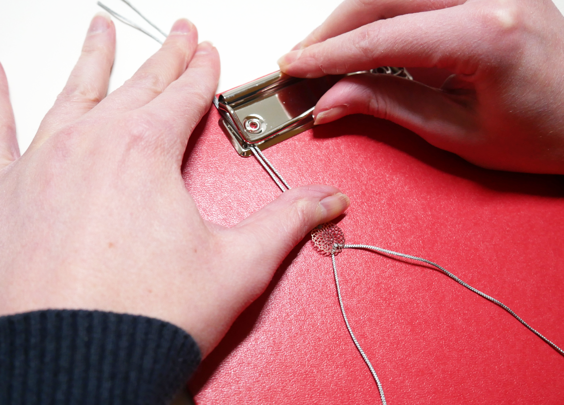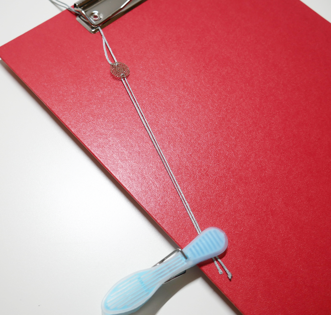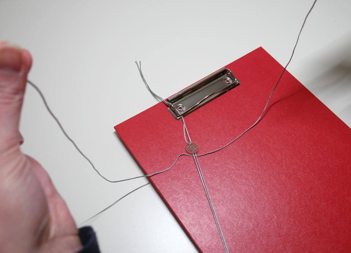 Nimm Dir die Nylonfaden in der gewünschten Farbe zur Hand. Schneide nun erstmal zwei Fäden mit jeweils einer Länge von 30 cm ab. Danach schneidest Du nochmals zwei Fäden mit einer Länge von 65 cm ab. Nun brauchst Du den Schmuckverbinder. Ziehe die 30 cm langen Fäden durch den Anhänger, auf den gegenüberliegenden Seiten ein. Ziehe danach die Enden der eingefädelten Fäden auf die gleiche Länge. Nun spannst Du eine Seite der Fäden am Anhänger unter die Klemme des Klemmbretts. Befestige den anderen Fäden mit der Wäscheklammer an das untere Ende des Brettes, sodass die am Anhänger befestigten Fäden fest gespannt sind.