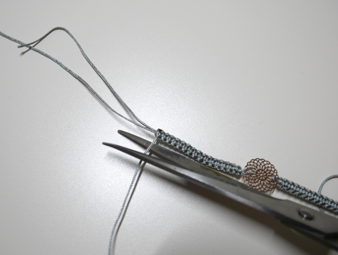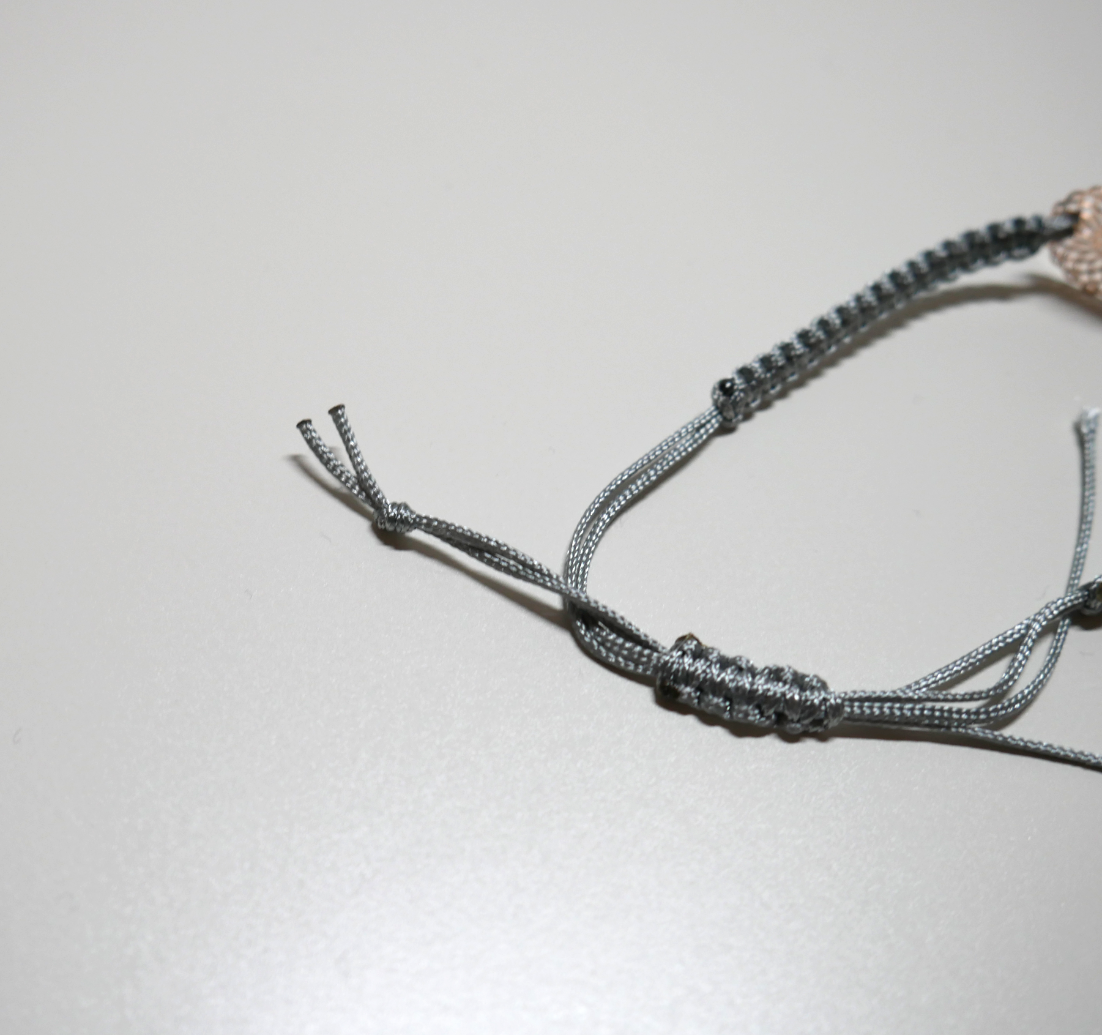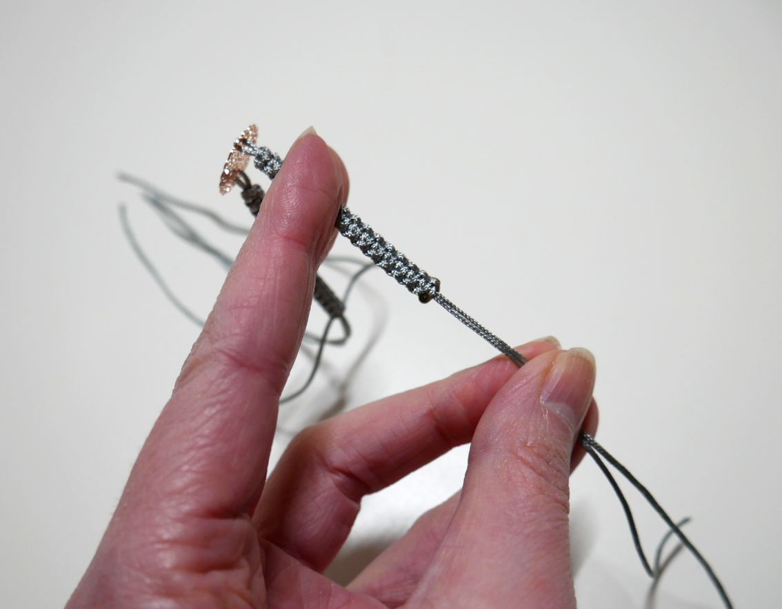 Wiederhole diese Schritte immer abwechselnd rechts und links. Ziehe dabei den Knoten fest zu. Diese Knotentechnik führst Du bis zum Ende des Armbandes auf beiden Seiten des Schmuckverbinders fort. Halte Dir das Armband immer mal wieder an Dein Handgelenk, um zu überprüfen, wie lang die beiden Bänder werden sollen.