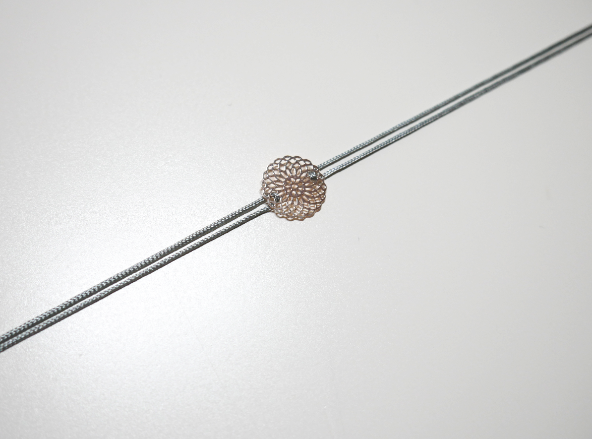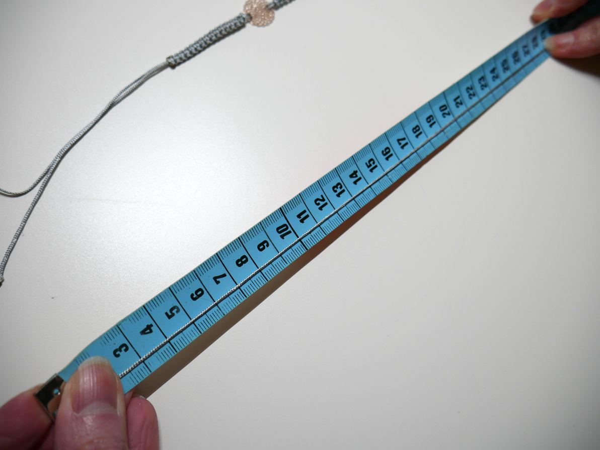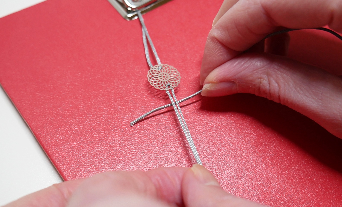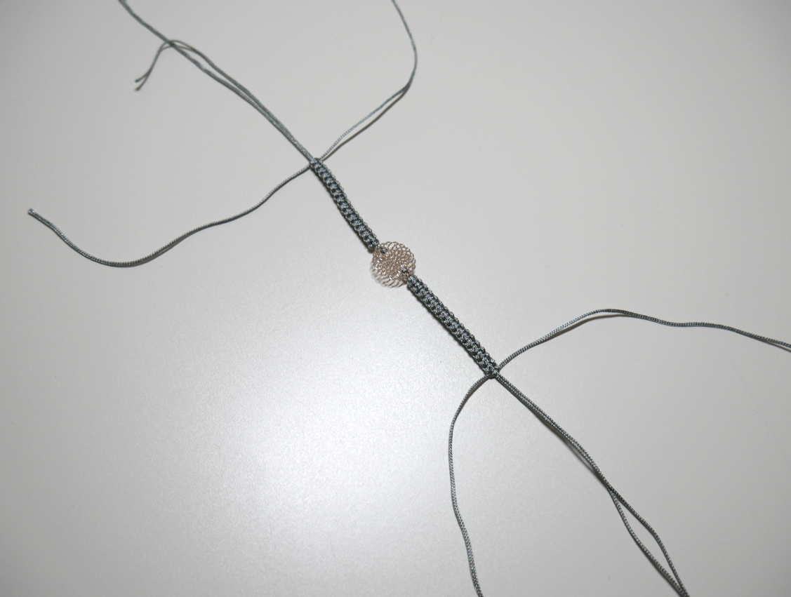 Wiederhole diese Schritte immer abwechselnd rechts und links. Ziehe dabei den Knoten fest zu. Diese Knotentechnik führst Du bis zum Ende des Armbandes auf beiden Seiten des Schmuckverbinders fort. Halte Dir das Armband immer mal wieder an Dein Handgelenk, um zu überprüfen, wie lang die beiden Bänder werden sollen.