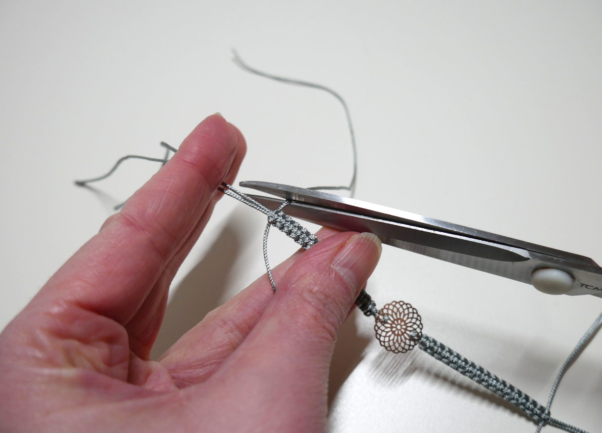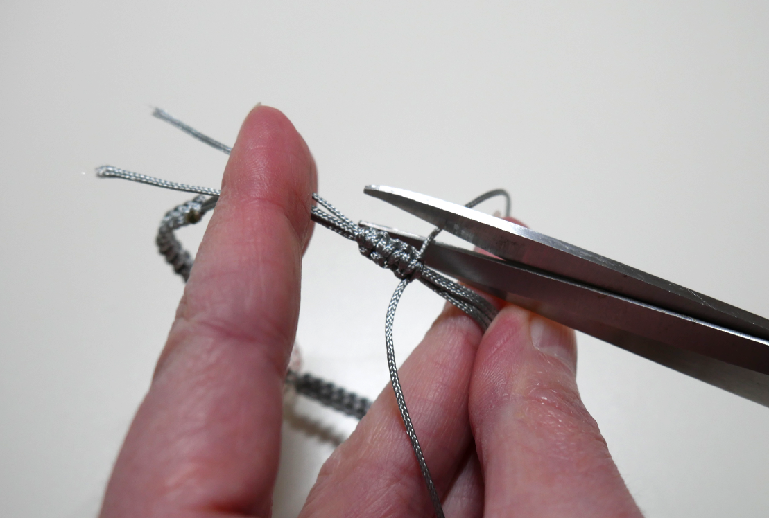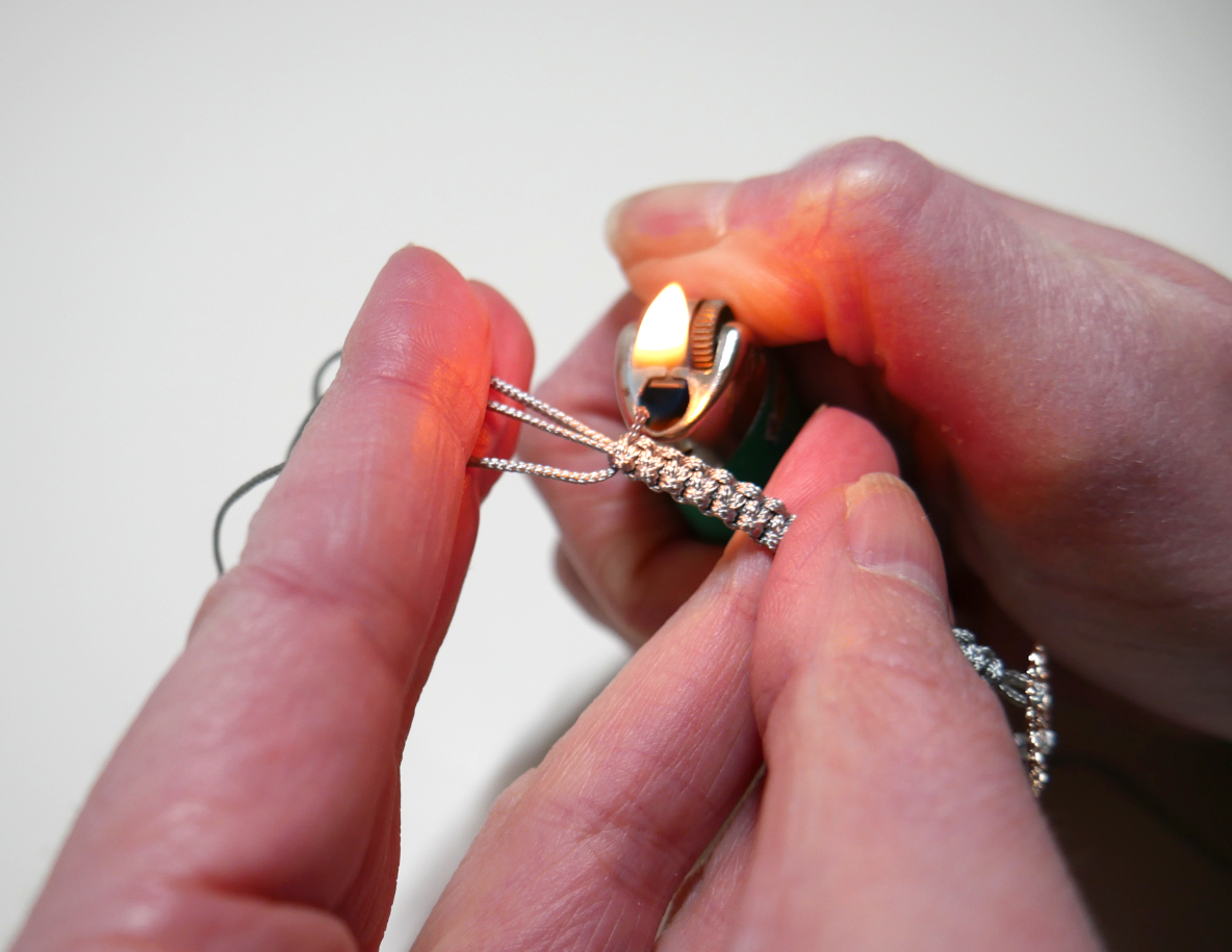 Wenn Du mit der Länge des Armbands zufrieden bist und beide Seiten gleich lang sind, dann schneide die überstehenden Enden der Fäden (mit denen Du die Knoten gemacht hast) ca. 2 mm ab. Mit dem Feuerzeug brennst Du die abgeschnittenen Fäden leicht runter. Der Nylonfaden schmilz und hält die Knoten fest geschlossen. An beiden Enden des Armbandes befinden sich nur noch die Doppel gespannten Fäden.