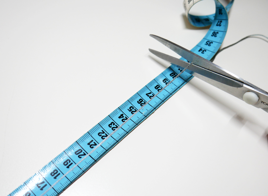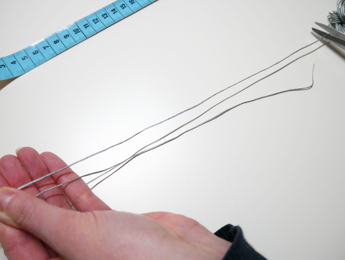 1. Nimm den Ersten 65 cm langen Nylonfaden und fädle ihn unter die gespannten Doppelfäden hindurch. Beiden Seiten des Fadens müssen gleich lang sein.