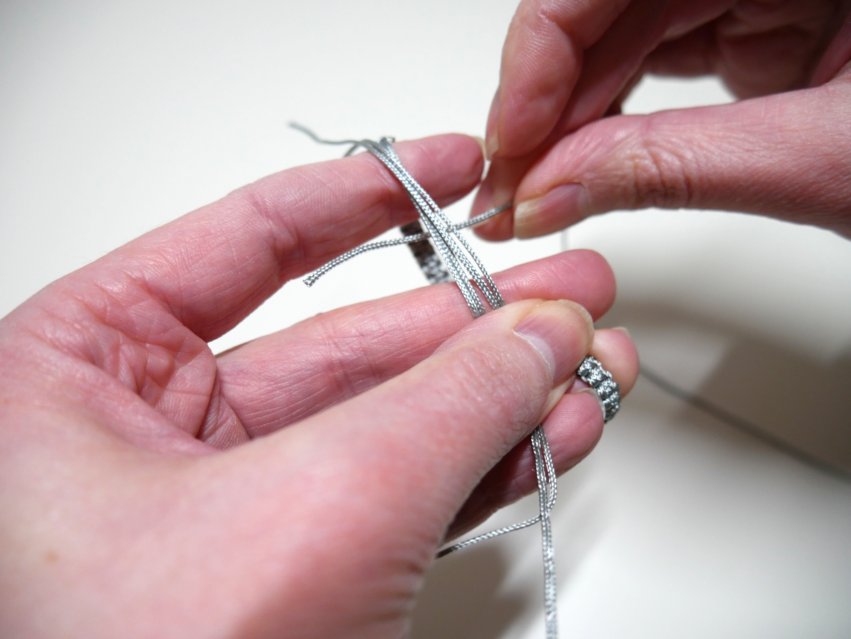 7. Den linken Faden ziehst Du unter den Doppelfäden durch und landest wieder in der Schlaufe des rechten Fadens.