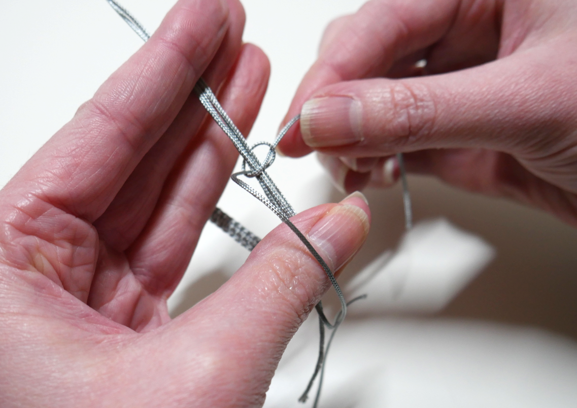 3. Den rechten Faden ziehst Du leicht unter den Doppelfäden durch, sodass Du in der Schlaufe des linken Fadens wieder raus kommst. Auch hier entsteht wieder eine Schlaufe.