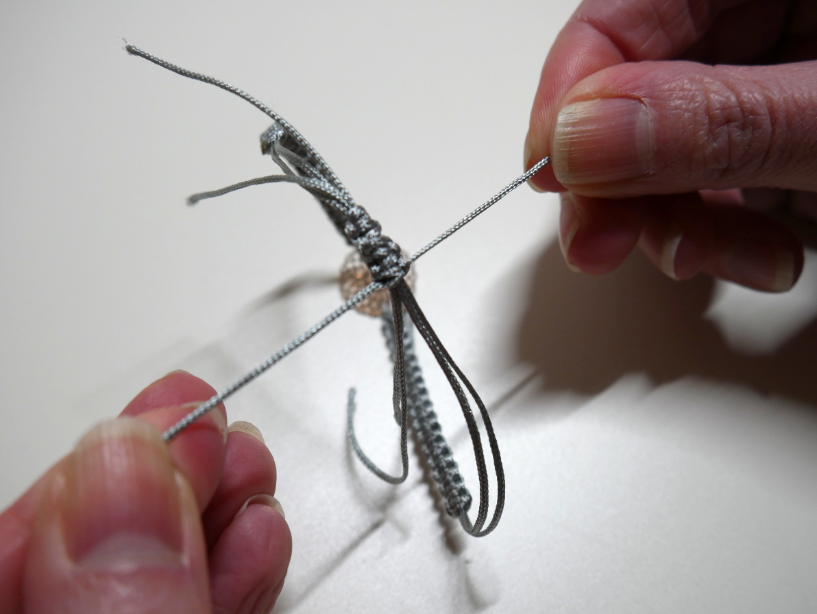 6. Genau dasselbe, nur andersherum, machst Du mit dem nächsten Knoten. Beginne mit dem rechten Faden, den Du über die eingespannten Doppelfäden legst.