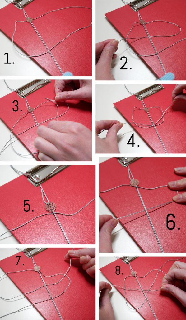 - Durch die nun entstandene Schlaufe des rechten Fadens, ziehst Du den linken Faden. So entsteht eine Art Brezel.