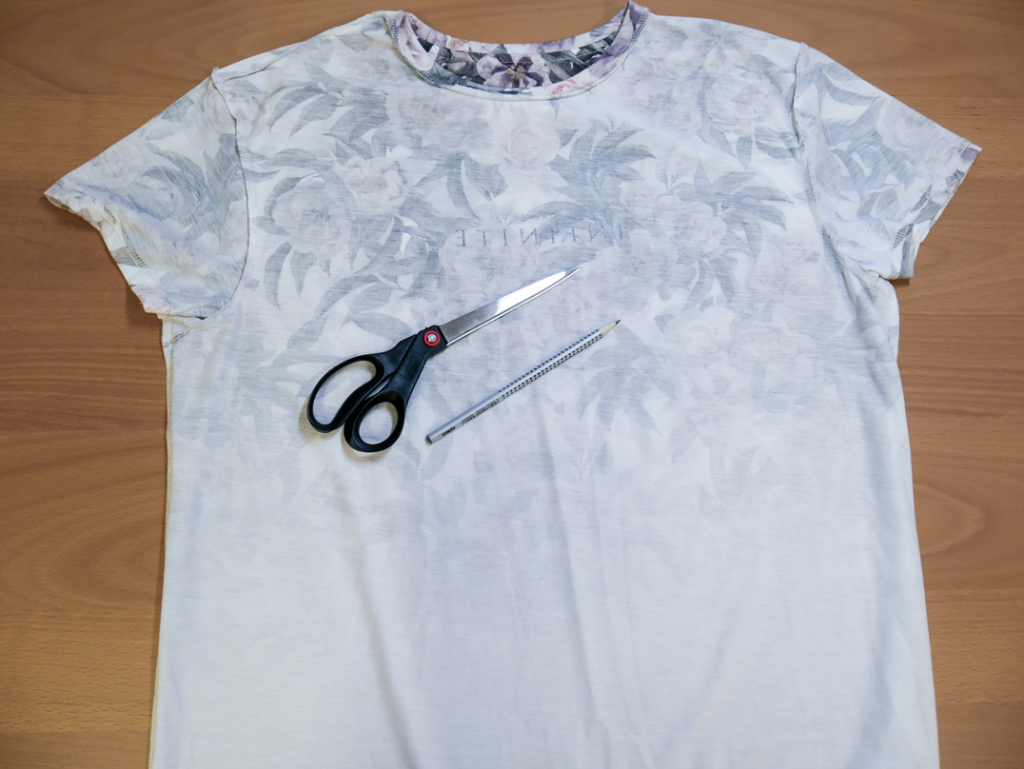 Übersicht Materialien: T-Shirt, Shere und Bleistift