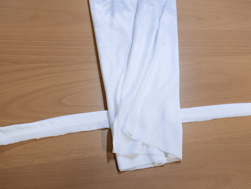 Jetzt musst Du nur noch den Bund, etwa 2 cm über der Naht, abschneiden. Das kannst Du entweder mit gefaltetem oder ausgebreitetem T-Shirt oder Top machen. Diesen abgeschnittenen Bund brauchen wir für den nächsten Schritt.
