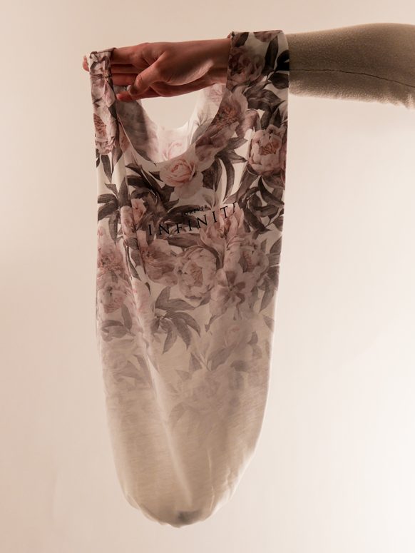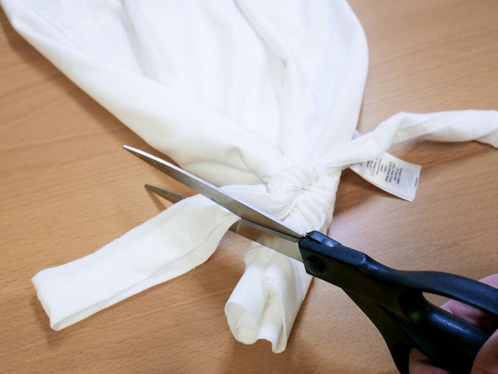Damit das T-Shirt jetzt zu einem Beutel wird, bindest Du den abgeschnittenen Rand um das untere offenen Ende herum und knotest es doppelt fest. Schneide die Enden, die überstehen ab, oder lässt sie dran. Das ist ganz dir überlassen.