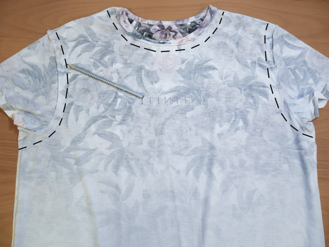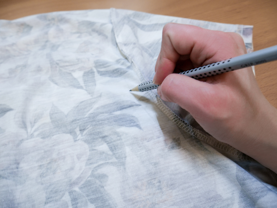Sollte der doppelte Stoff für Deine Schere zu dick sein, kannst Du das T-Shirt auch einfach ausgebreitet und auf links gedreht auf den Tisch legen. Zeichne Dir die Schneidelinien mit dem Bleistift vor, damit die Henkel der Tasche nicht zu unterschiedlich werden. Markiere also mit einem Bleistift die Stellen an denen das Shirt abgeschnitten werden muss. Als Nächstes nimmst Du die Schere und schneidest entlang der Linien den Kragen und die Ärmel ab.