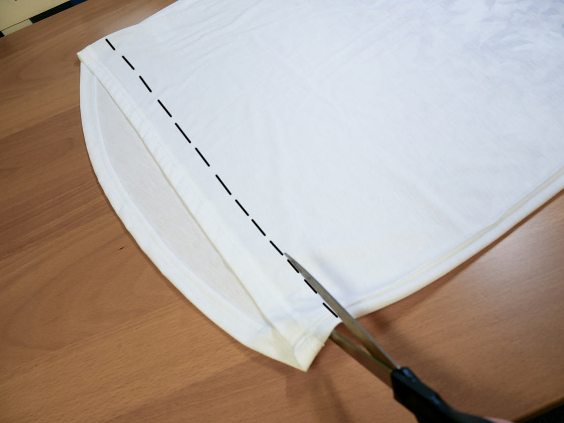 Du fängst damit an, dass Du Dein T-Shirt erstmal auf links drehst und es in der Mitte faltest, sodass die Ärmel genau übereinander liegen. Nun kannst Du mit einer scharfen Schere, mit einem Abstand von ca. 2 cm zu den Nähten, die Ärmel Abschneiden. Danach schneidest Du etwas keilförmiger den Kragen ab.