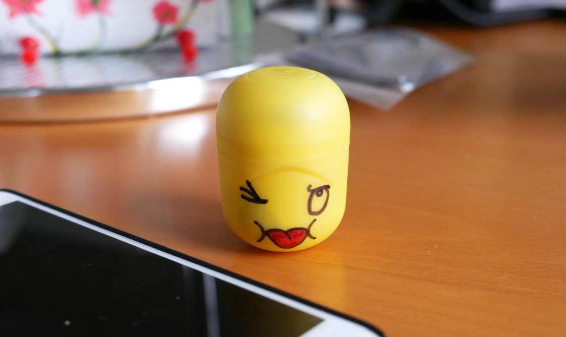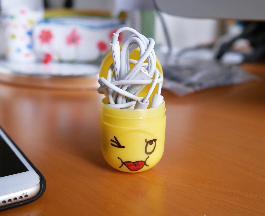 Anschließend ziehst Du die aufgewickelten Kopfhörer von Deinen Fingern ab und steckst sie so in das Plastikei hinein. Jetzt musst Du nur noch den Deckel schließen und fertig ist die neue Aufbewahrungsbox!