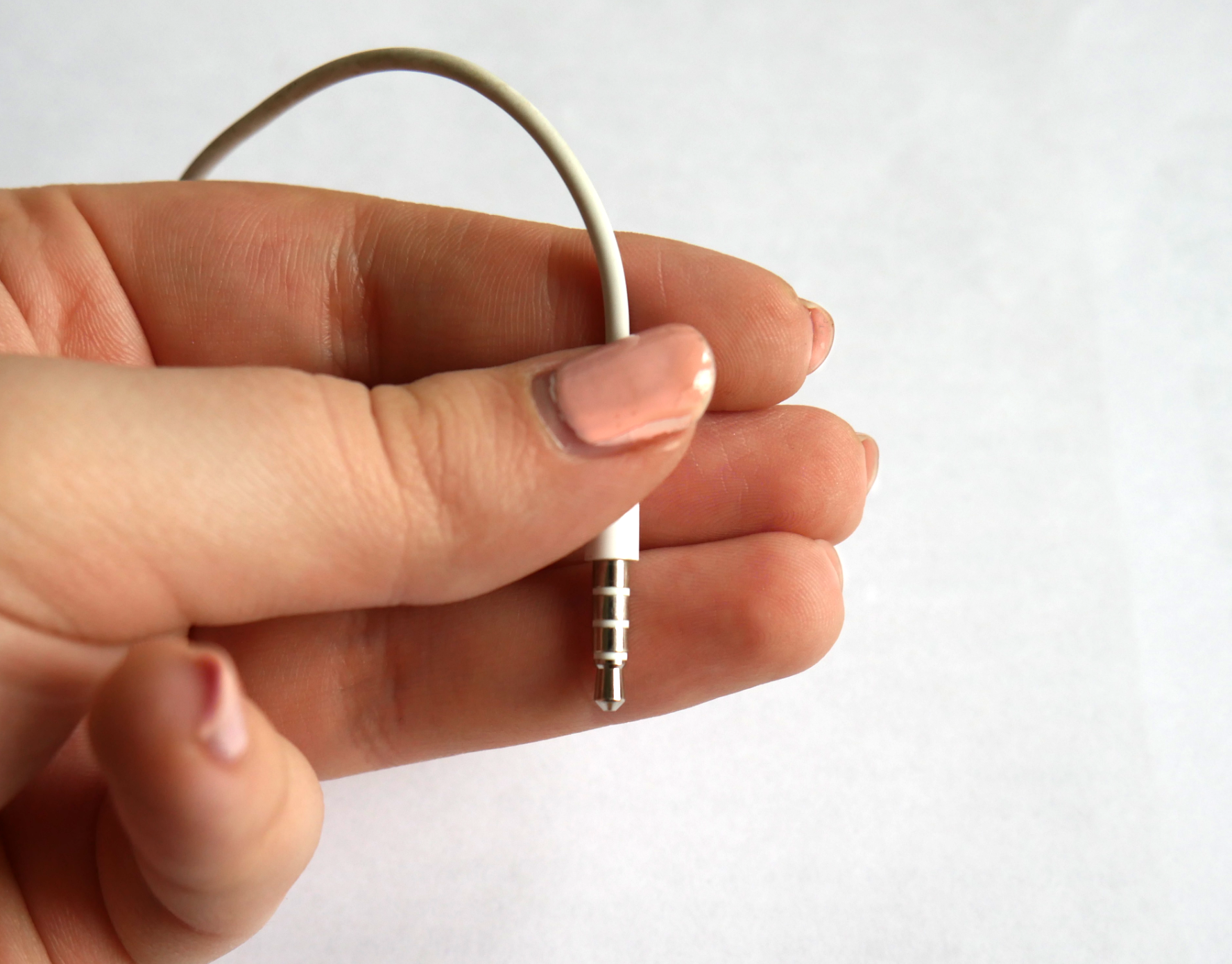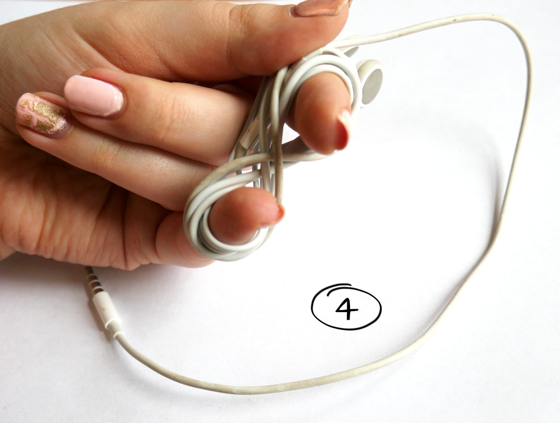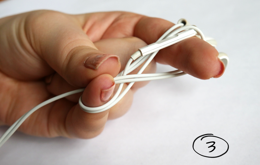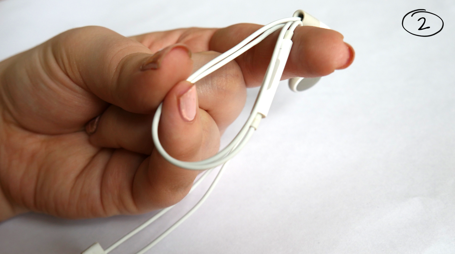 Strecke Zeige-, Mittel- und Ringfinger zusammen aus. Halte den Stecker der Kopfhörer mit dem Daumen fest. Nun wickle das Kabel von oben erst über und dann hinter die drei Finger, bis Du wieder vorn angekommen bist. Das wiederholst Du so oft, bis das komplette Kabel auf Deinen drei Fingern aufgerollt ist.