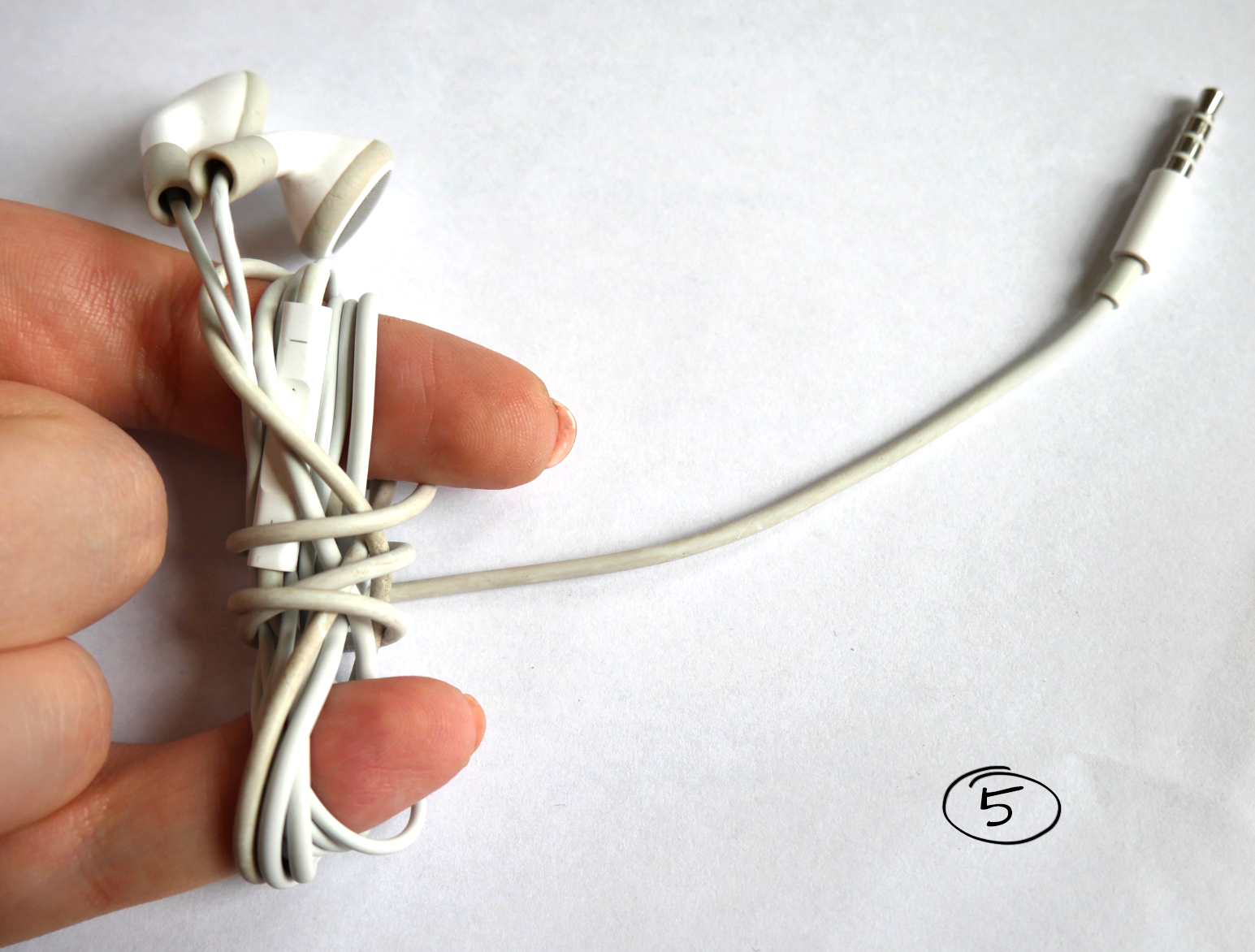 Spare Dir am Ende ein Stück Kabel von circa zehn Zentimeter auf und wickle diesen Rest um die Mitte der gekreuzten Kabel. Jetzt musst Du nur noch den Stecker durch die Schlaufe ziehen und fertig ist Dein Knoten freies Kopfhörer Kabel.