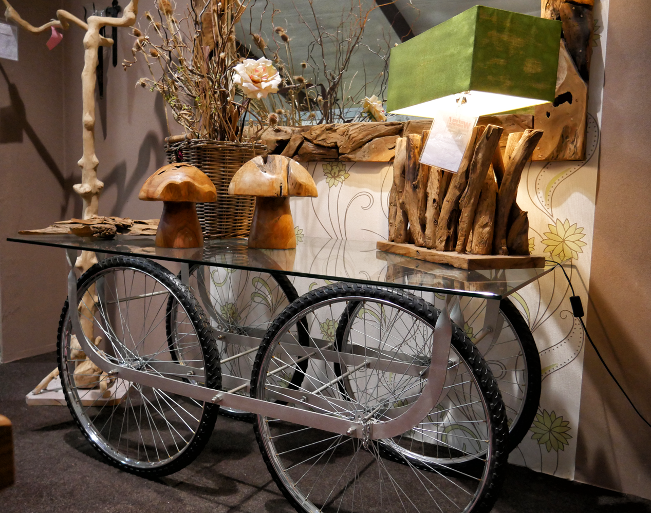 Nach dem Durchqueren des Eingangsbereichs stand ich in der großen Ausstellungshalle mit über 2.000 Quadratmetern. Sofort sind mir die ersten außergewöhnlichen Möbelstücke ins Auge gefallen. Ein echtes Highlight war das original indische Taxi mit einer eingebauten Sitzbank und leuchtenden Scheinwerfern. So ein ausgefallenes Möbelstück hatte ich noch in keinem Möbelhaus zuvor gesehen. Als ich den Blick durch die Halle schweifen ließ, gefielen mir auf Anhieb weitere der einzigartigen Möbel. Zum Beispiel der Glastisch mit großen Fahrradrädern oder die Konsole aus Wurzelholz. Echte Hingucker.