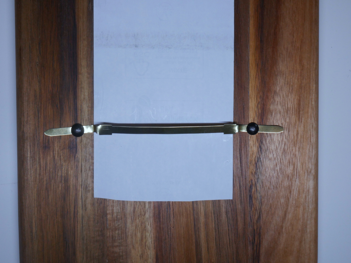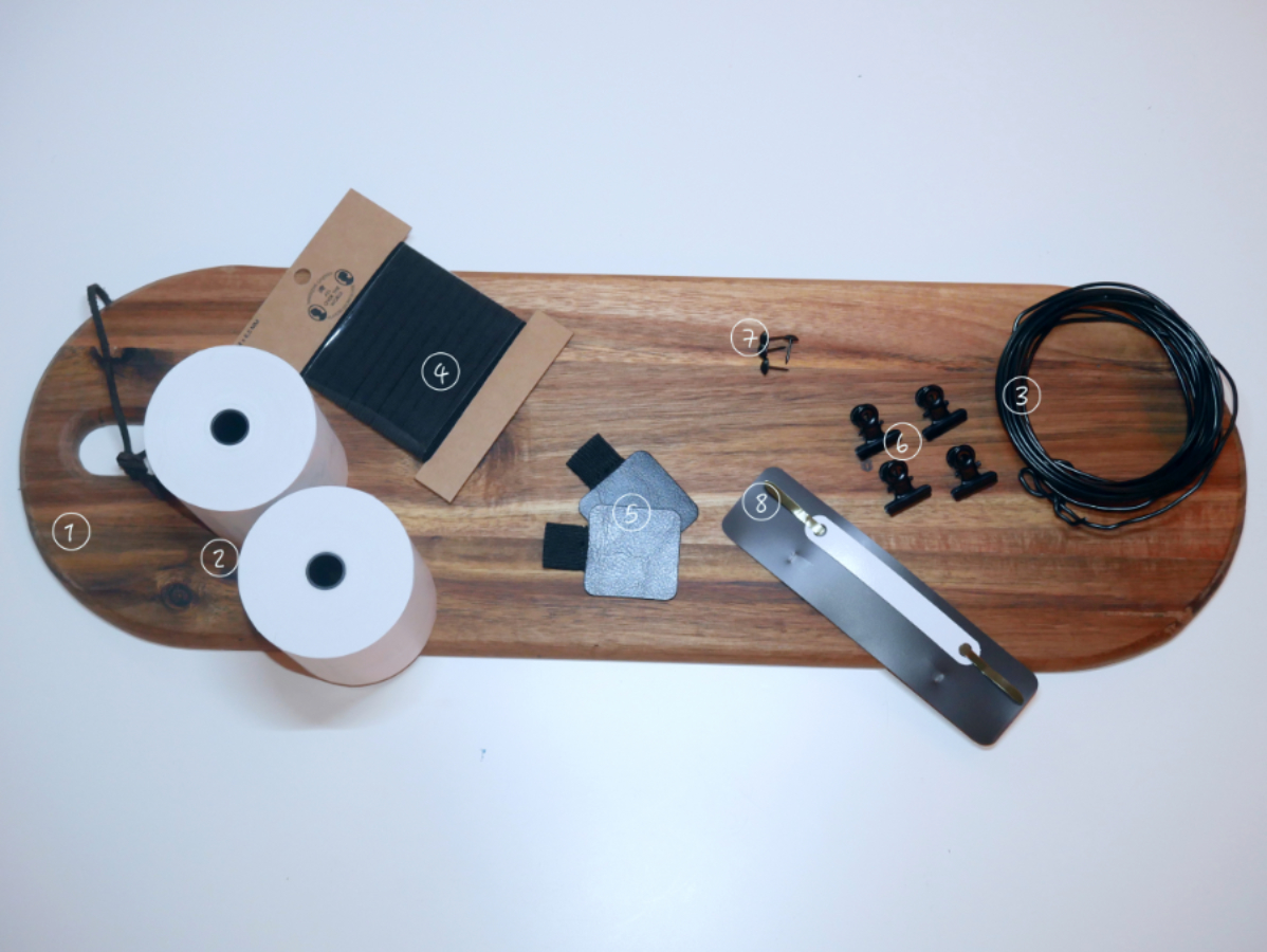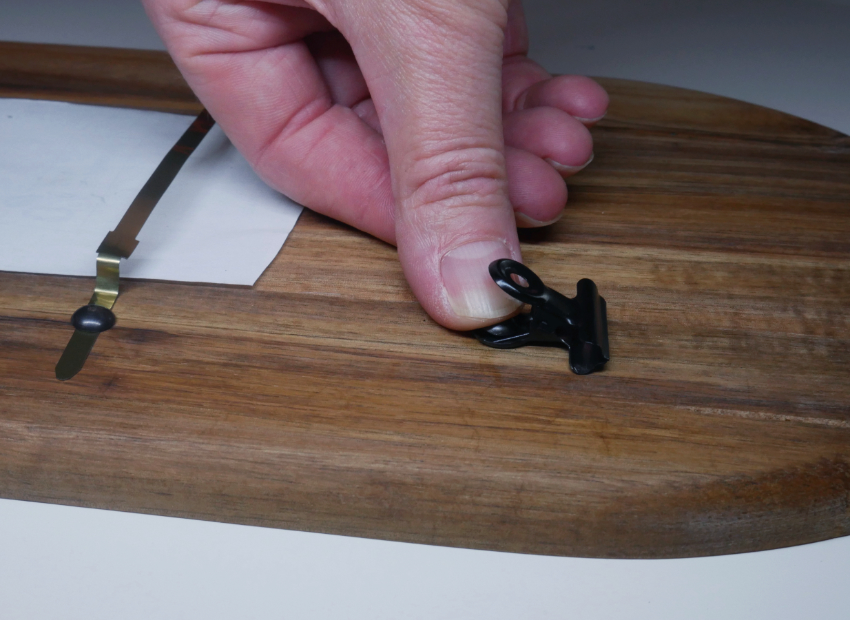 Als Nächstes wird ein Metallstab als Abrisshilfe am Brett befestigt, weshalb Du zwei weitere Stecknadeln benötigst. Ich habe den Metallstab von einem einfachen Schnellhefter umfunktioniert. Diesen legst Du waagerecht über das Ende des Kassenzettels und schlägst jeweils einen Nagel in die beiden Enden. Ist das Papier der Kassenrolle nun unter dem Metall, kann es ganz einfach mit einer Hand abgerissen werden.