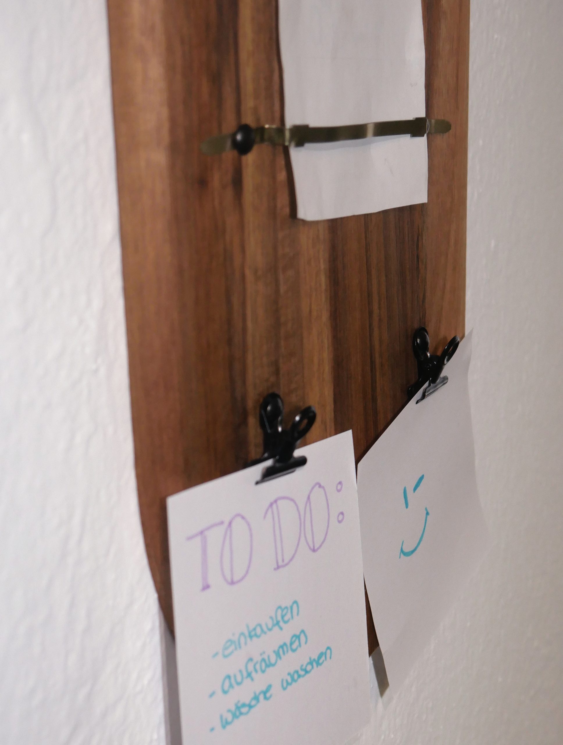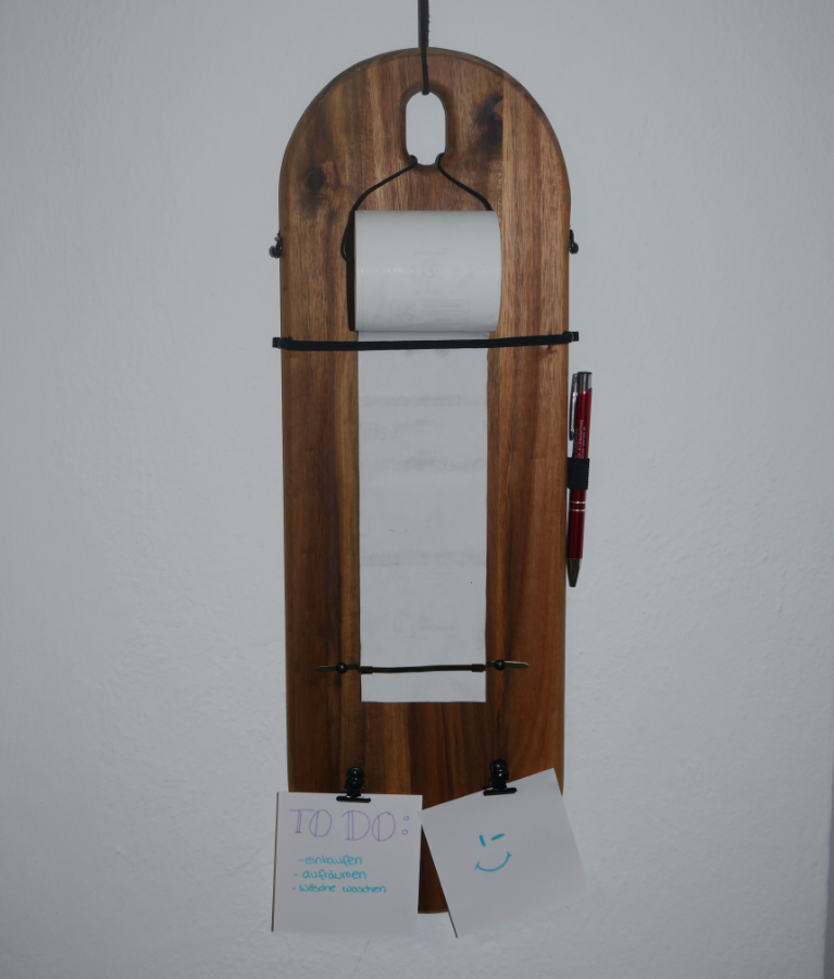 Nun hast Du ein cooles, selbst gemachtes Schreib- bzw. Notizbrett, auf dem Du ganz einfach Einkaufs- oder To-do-Listen schreiben kannst und Notizzettel anbringen kannst. Mit dem Notizrollenhalter wirst Du nie wieder etwas vergessen. Viel Spaß damit!