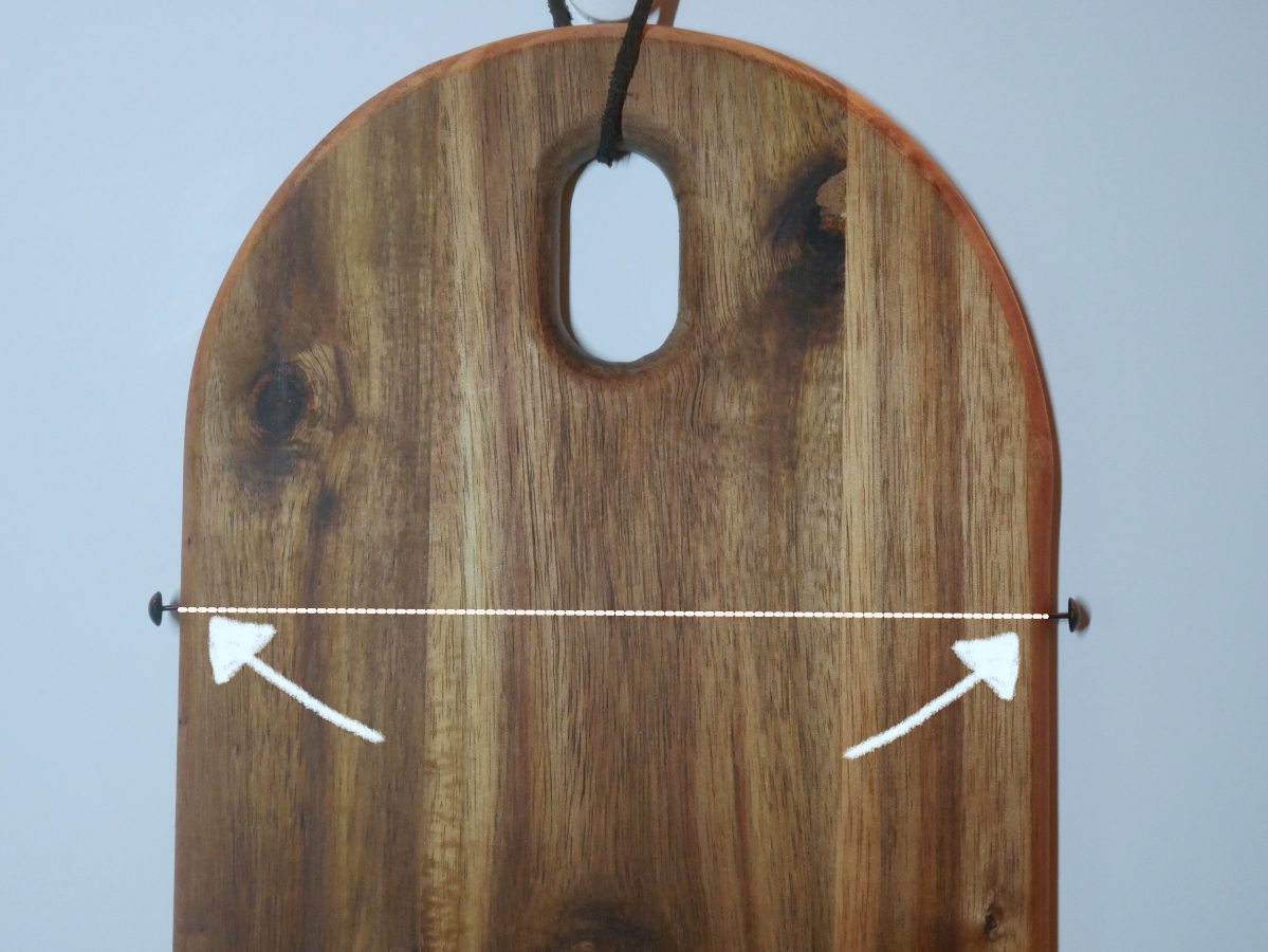Zunächst wird die Kassenrolle mit einem Draht im oberen Teil des Brettes angebracht. Dazu benötigst Du zwei kleine Nägel bzw. Stecknadeln, die links und rechts am Seitenrand im oberen Bereich des Brettes befestigt werden. Damit die Stecknadeln auf einer Höhe sind, legst Du das Lineal horizontal auf das Brett und markierst mit einem Bleistift, an welcher Position die Stecknadeln angebracht werden sollen. Anschließend kannst Du die Stecknadeln mit einem Hammer in das Holz einschlagen. Achte dabei darauf, dass Du sie nicht ganz reinschlägst, sondern zwischen dem Kopf und dem Brett noch genügend Platz für den Draht ist.