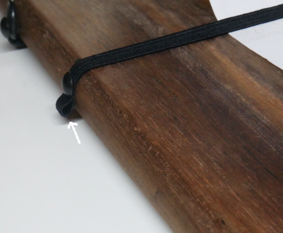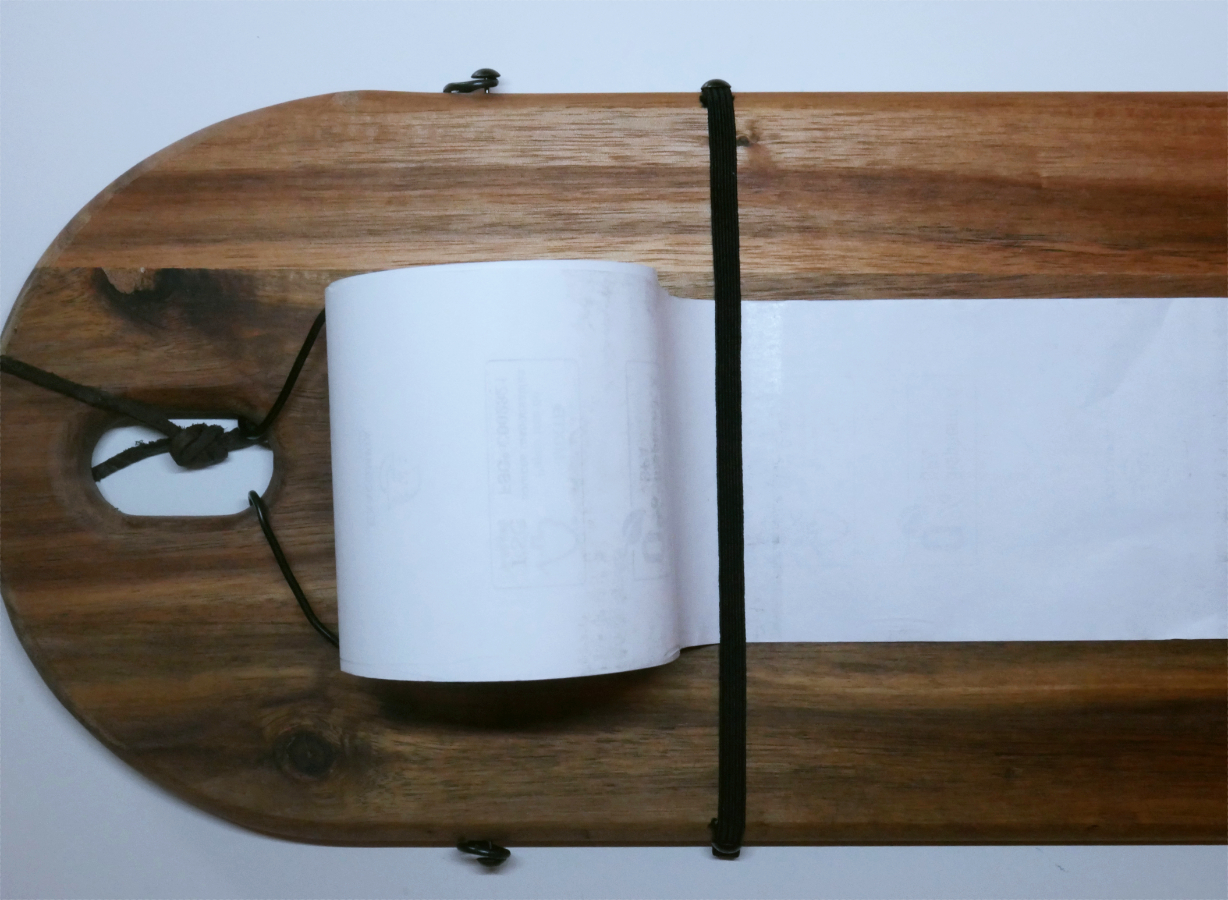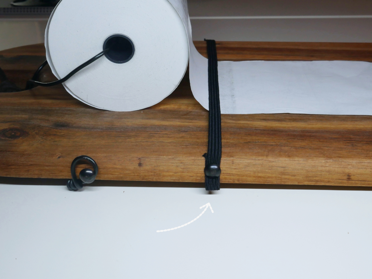 Damit Du einfacher auf der Kassenrolle schreiben kannst, sollte das Papier am Brett anliegen und nicht verrutschen. Dazu nimmst Du das Gummiband und befestigst zunächst das freiliegende Ende an der einen Seite des Brettes mit einer Stecknadel. Damit es etwas Schöner aussieht, habe ich das Ende des Gummibands einmal umgeklappt und unter dem Nagel „versteckt“. Anschließend ziehst Du das Gummiband horizontal zur anderen Seite, schneidest so viel ab, wie Du benötigst und befestigst das Ende genauso wie das andere Ende. Nun kannst Du das Papier unter dem Gummiband durchschieben.