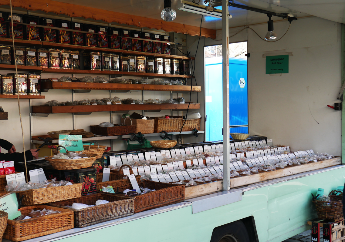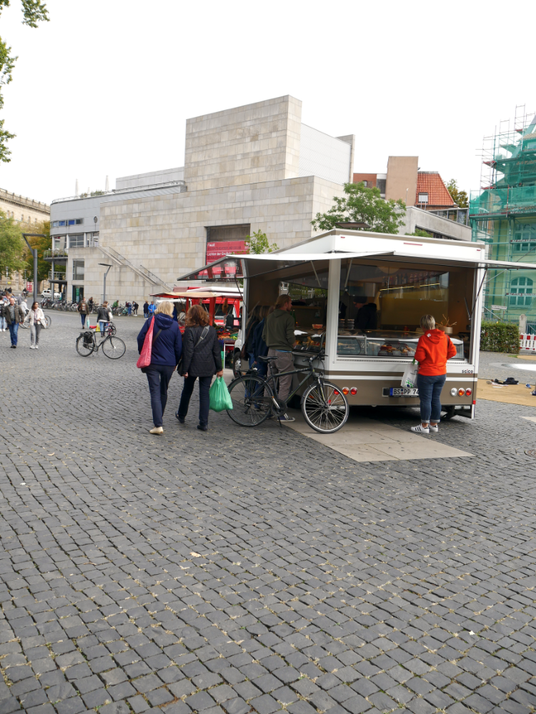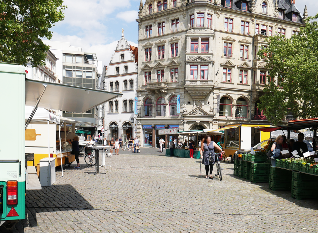 Da sich der Wochenmarkt am Rand der Fußgängerzone der Braunschweiger Innenstadt befindet, können auch noch Besorgungen erledigt werden.