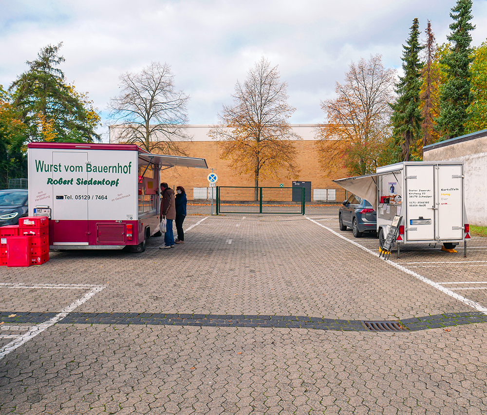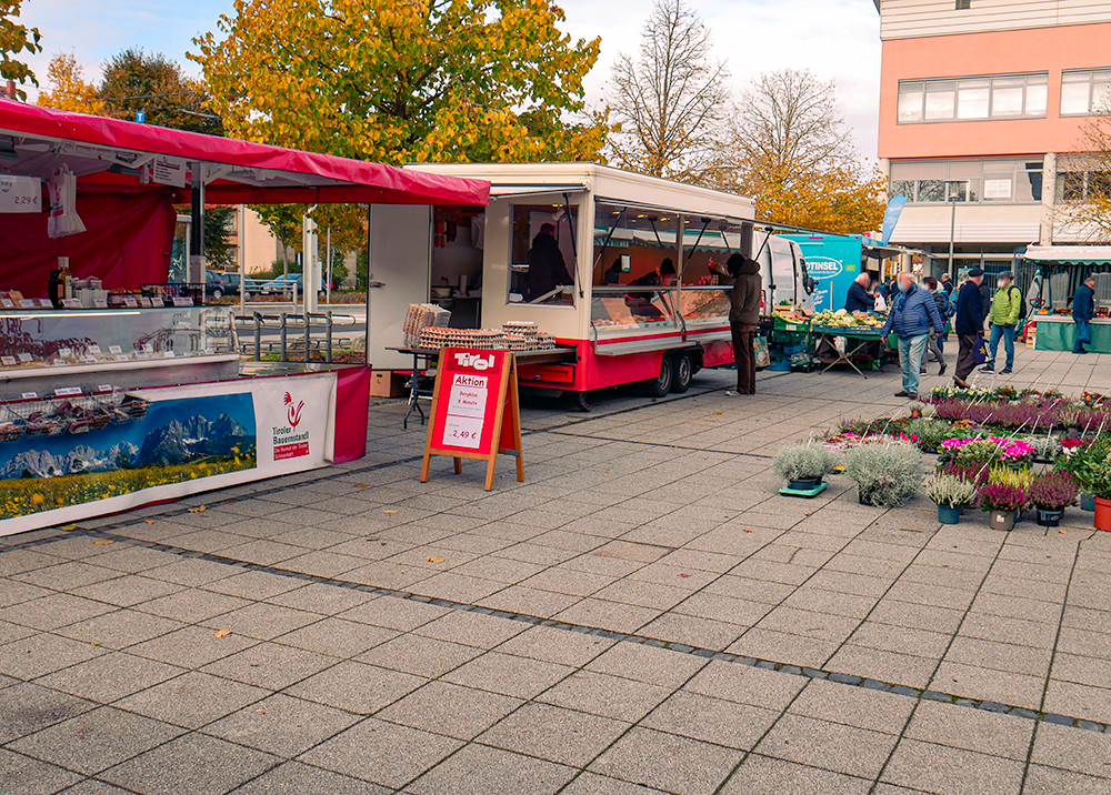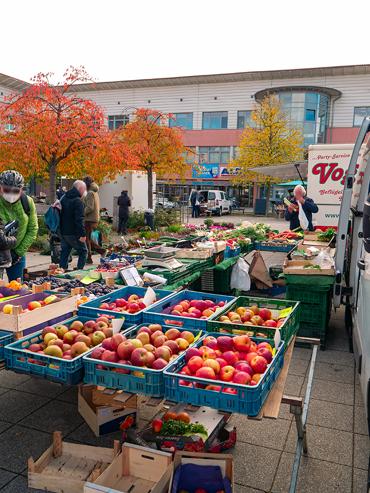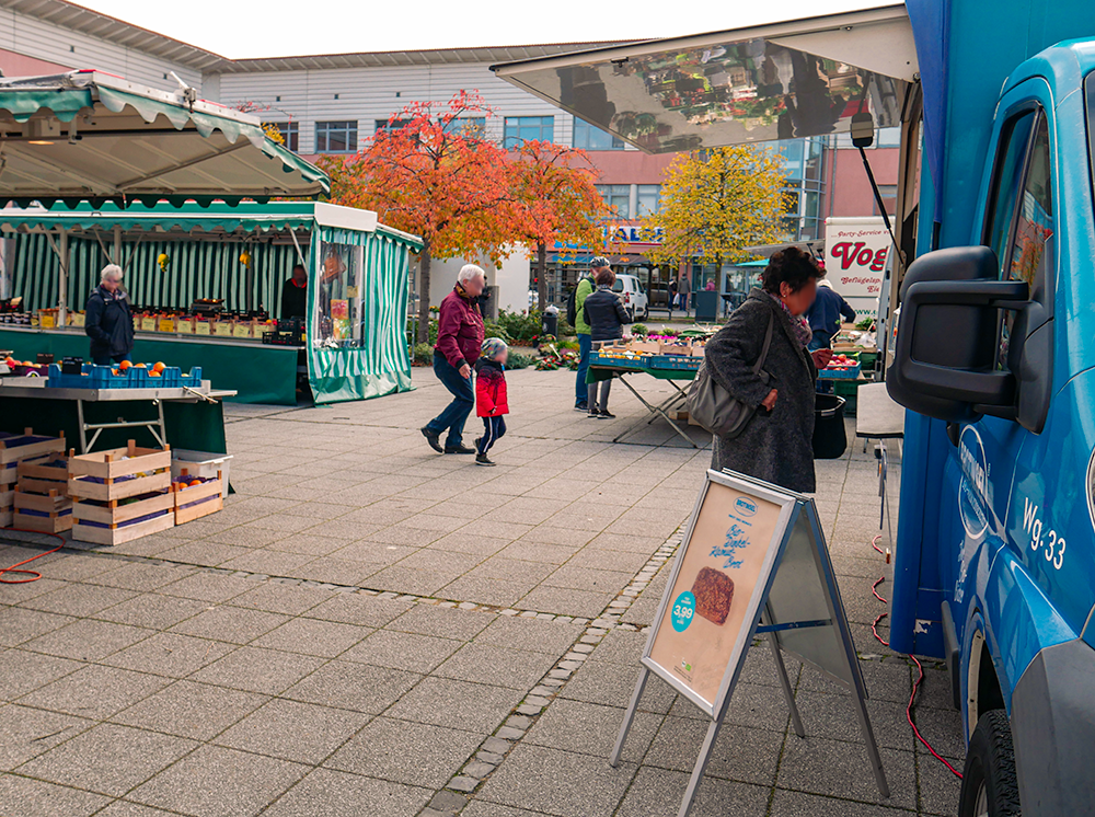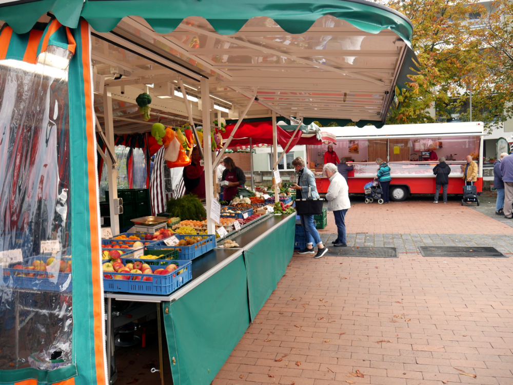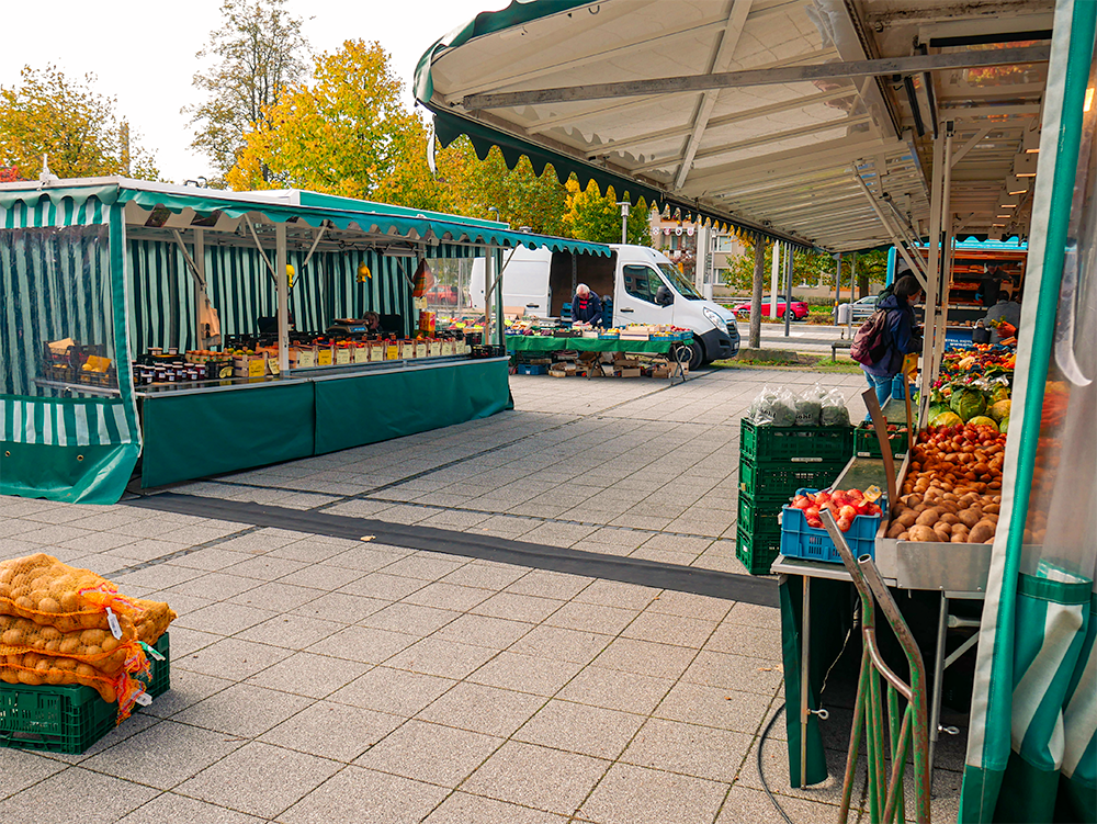 Der sonst mit Autos gefüllte Parkplatz bietet am Dienstag und Freitag genug Platz für die verschiedensten Händler:innen und kauffreudigen Menschen. Das Angebot reicht von Obst und Fleisch bis hin zu Fisch, Blumen, Backwaren, Kleidung und saisonalen Produkten wie z.B. Spargel.