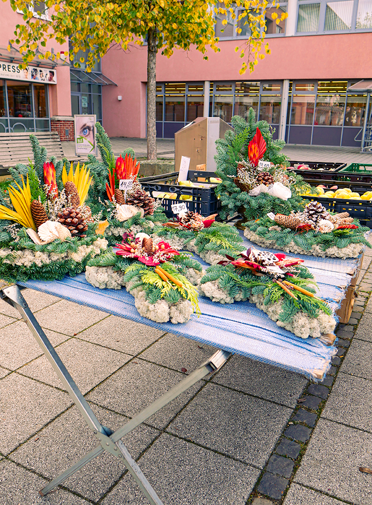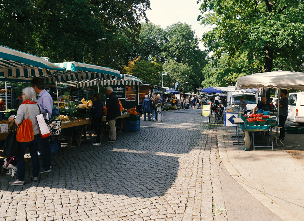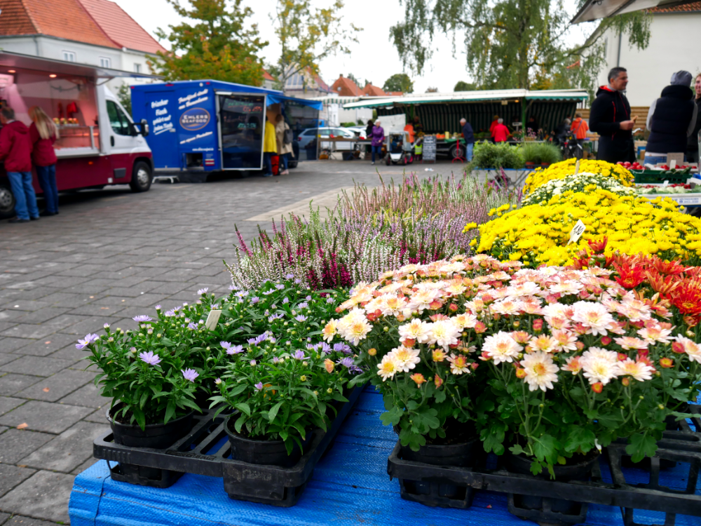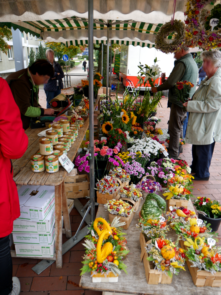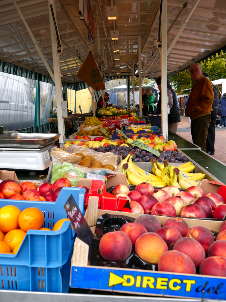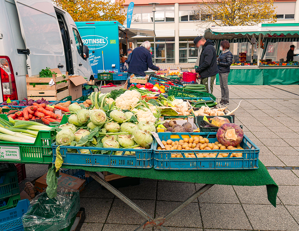 Der sonst mit Autos gefüllte Parkplatz bietet am Dienstag und Freitag genug Platz für die verschiedensten Händler:innen und kauffreudigen Menschen. Das Angebot reicht von Obst und Fleisch bis hin zu Fisch, Blumen, Backwaren, Kleidung und saisonalen Produkten wie z.B. Spargel.