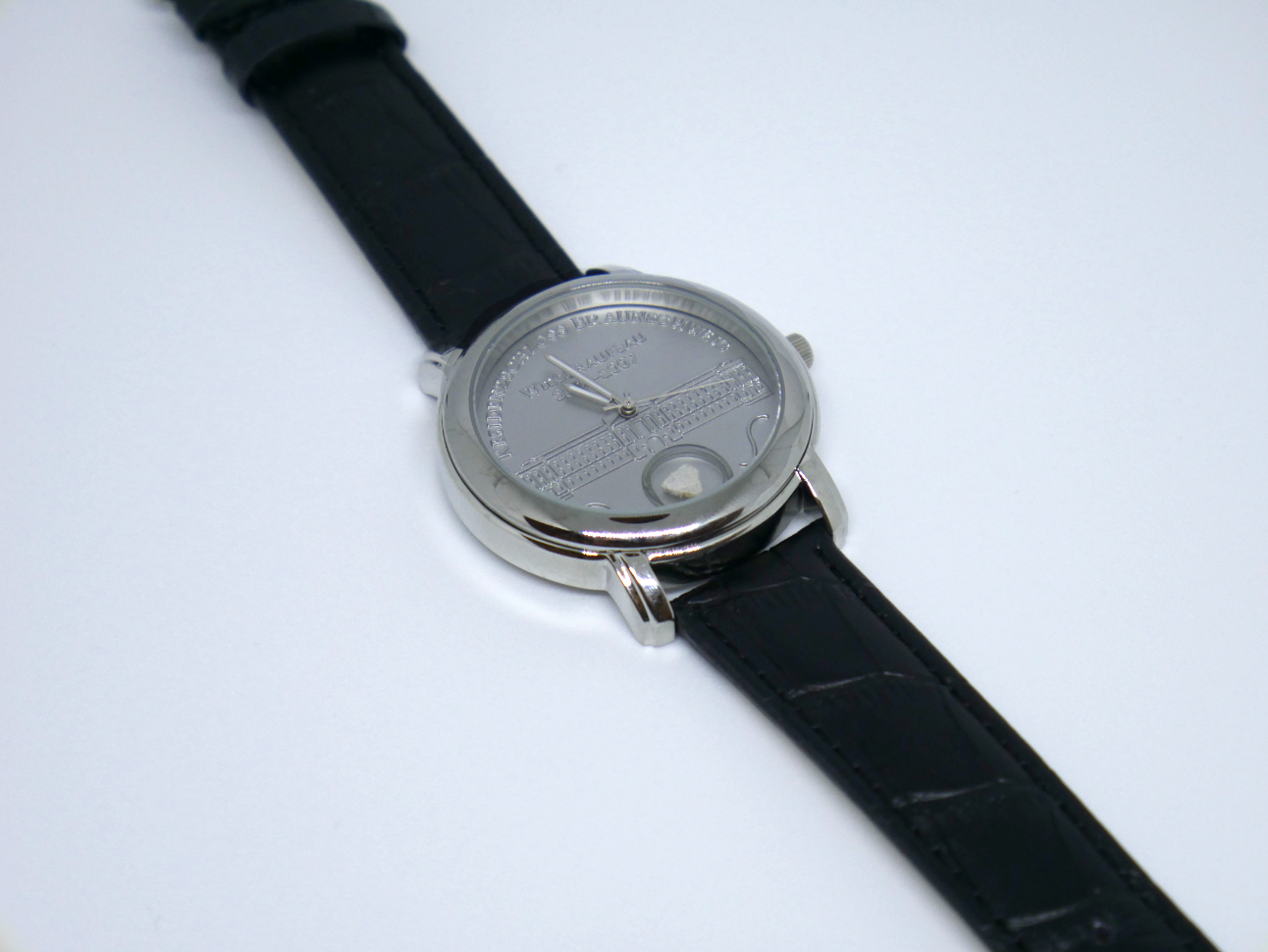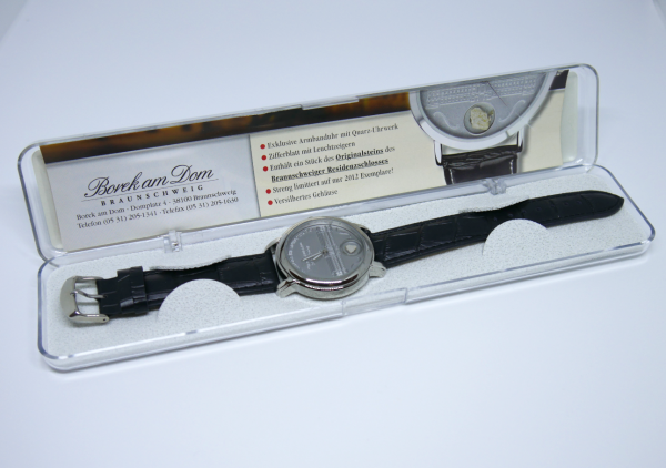 Das Echtleder-Armband der Uhr sorgt für ein angenehmes Tragegefühl. Diese Schloss-Uhr ist batteriebetriebenen und hat ein eingebautes Quarz-Uhrwerk. Das Gehäuse ist Zink legiert und versilbert. Auf dem versilberten Zifferblatt ist das Braunschweiger Schloss gut in Szene gesetzt. Über dem Schloss stehen die Jahreszahlen des Wiederaufbaus von 2005 bis 2007. Die Leuchtzeiger erleichtern es bei unterschiedlichen Lichtverhältnissen die Uhrzeit über das Zifferblatt zu erkennen. Das Besondere an dieser Armbanduhr – Sie enthält ein Stück des Originalsteins des Braunschweiger Residenzschlosses. In einer kleinen runden Fassung befindet sich ein Stück der Geschichte Braunschweigs. Die Uhr ist auf nur 2012 Exemplare streng limitiert.