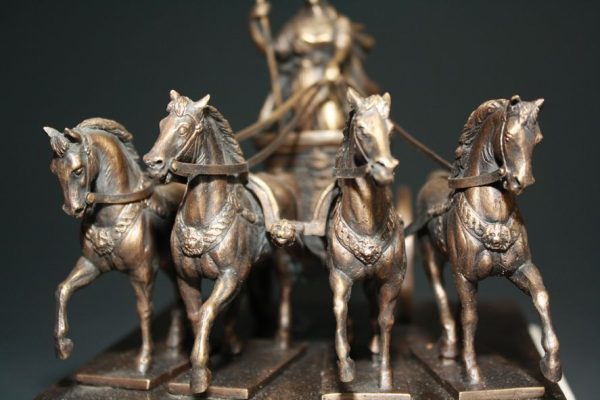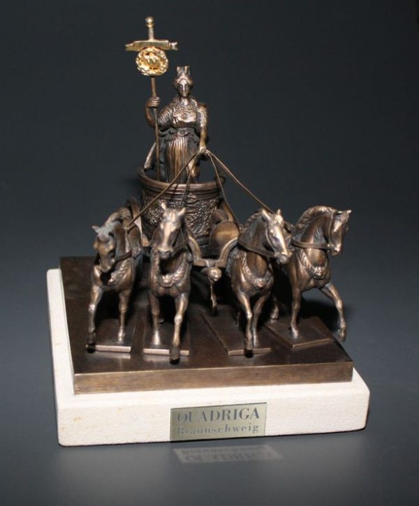 Die Figuren der Quadriga wurden in feinster Handarbeit erschaffen. Für dieses Modell der Braunschweiger Quadriga, wurde sogar die Original-Lithiumbronze des echten Vorbildes verwendet.