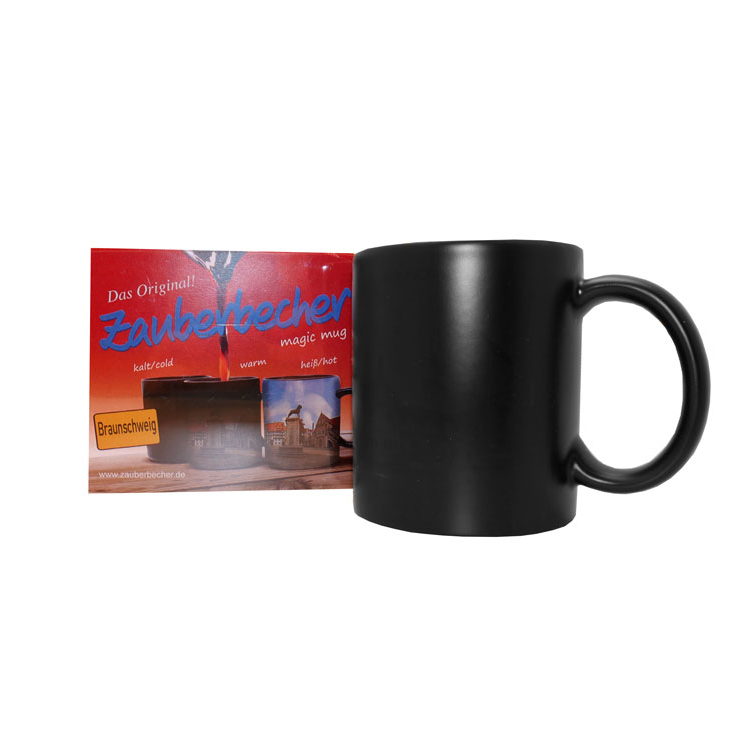 Mit der Braunschweiger Magic Tasse verwandelt sich ein schwarzer, unscheinbarer Becher in ein buntes Braunschweig-Motiv.